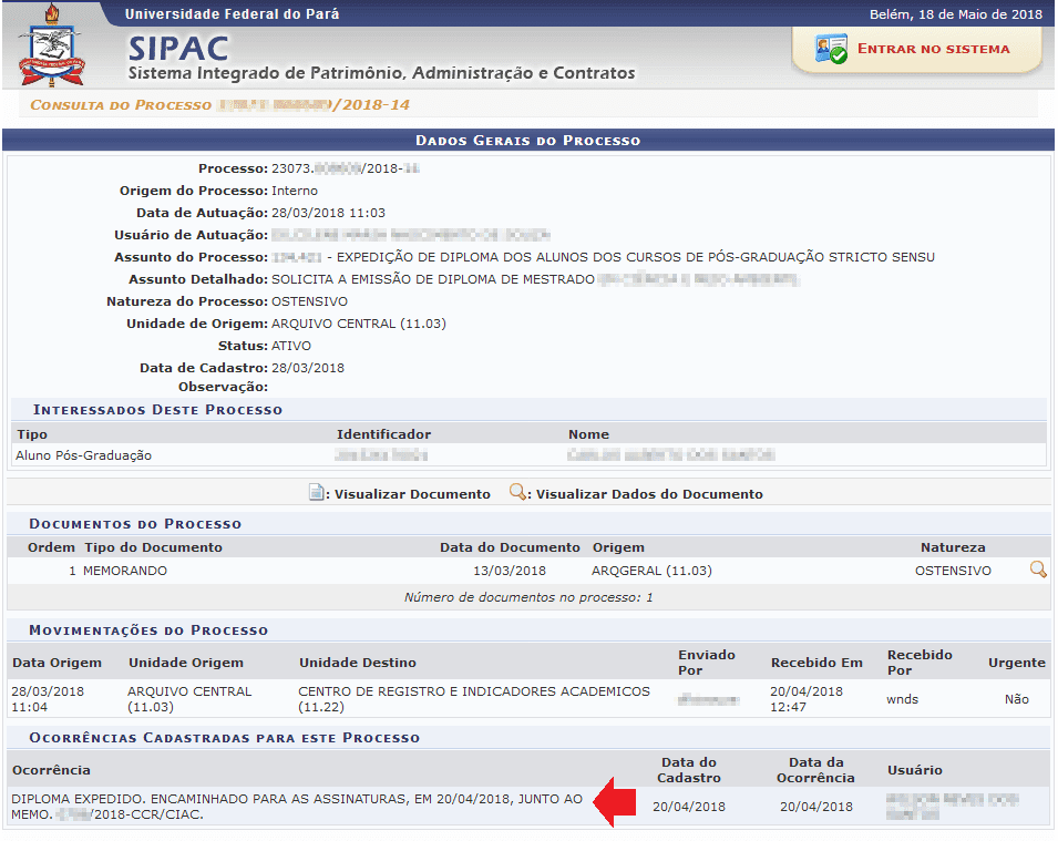 Nos dados gerais verifique na parte de ocorrências cadastradas para este processo.