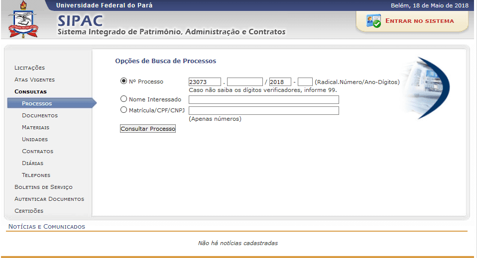 2. Preencha com número do processo, nome interessado ou Matrícula / CPF / CNPJ;
